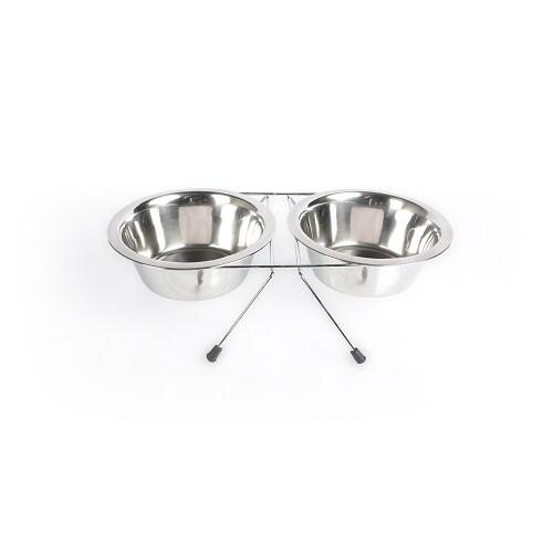 Doppelnapf aus Edelstahl für Granulat und Wasser, besonders geeignet für kleine und mittelgroße Hunderassen. Standteil des Produkts.