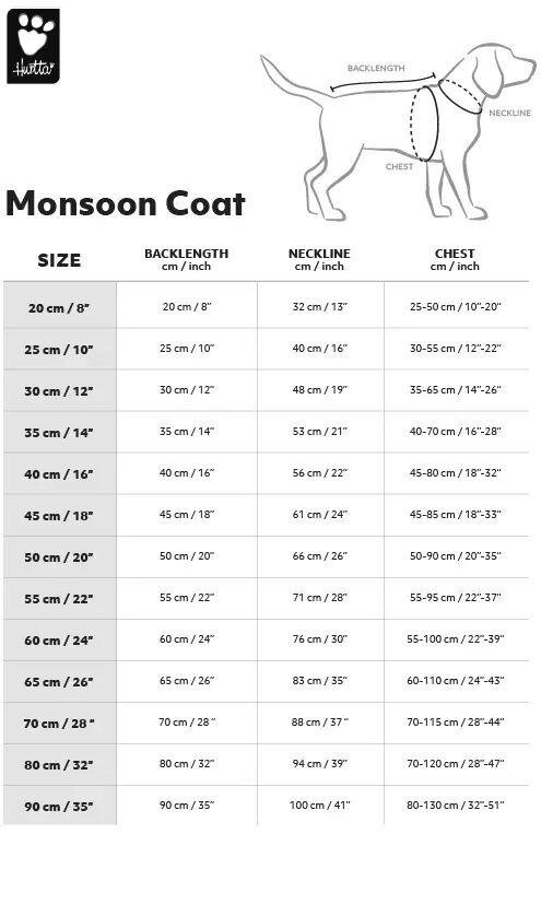 Durch die völlig neue technische Struktur des Kragens können die Nähte noch umfassender als bisher abgeklebt werden. Im Gegensatz zu den Vorgängermodellen sind die Kragennähte von Monsoon vertikal, sodass der Kragen vollständig wasserdicht ist. Zusätzlich befindet sich ein Regenhalsband aus wasserdichtem Material am Rand des Halsbands, das verhindert, dass Wasser entlang des Halses des Hundes in das Fell gelangt. Das angenehm weiche Halsband kann um den Hals des Hundes festgezogen werden, um den Brust- und Nackenbereich zu schützen.