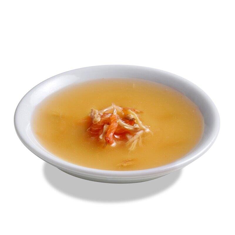 Fleischbrühe vom Huhn und Lachs (84%); Hühnerfleisch (9%); Lachs (6%); Mineralstoffe (1%)