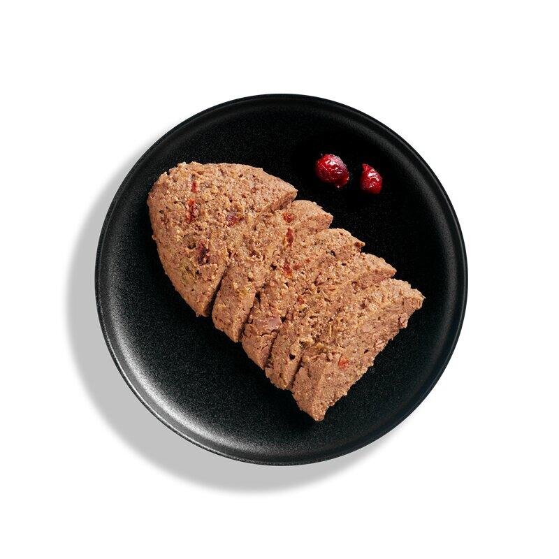 Kaninchenfleisch, -herz, -leber, -lunge, -niere (30 %); Hühnerfleisch, -leber, -herz (30 %); Fleischbrühe von Kaninchen, Huhn, Rind (28,3 %); Rinderlunge (6,5 %); Cranberries (4 %); Eierschalen, getrocknet (0,5 %); Mineralstoffe (0,5 %); Lachsöl (0,2 %)