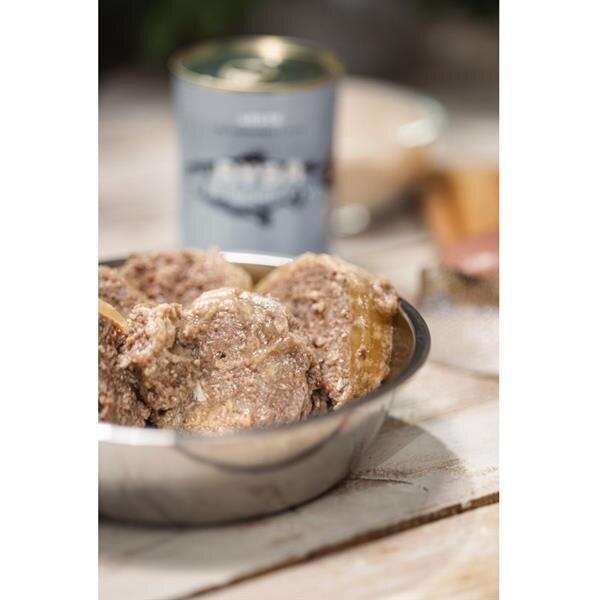 Saftiges Alleinfutter in Dosen enthält 95 % gehackten Fisch in der festen Komponente. Die Dose enthält außerdem gemahlenes Fischgrätenpulver, das als natürliche Quelle für Kalzium und Phosphor in einem natürlichen Verhältnis fungiert, sowie 5 % Pflanzenbestandteil, der den Mageninhalt pflanzenfressender Beutetiere in freier Wildbahn ersetzt. Reis versorgt die Hunde mit den notwendigen Nähr- und Mineralstoffen und sorgt für die Aufnahme des Saftes, der beim Hitzesterilisieren vom Fleisch freigesetzt wird.