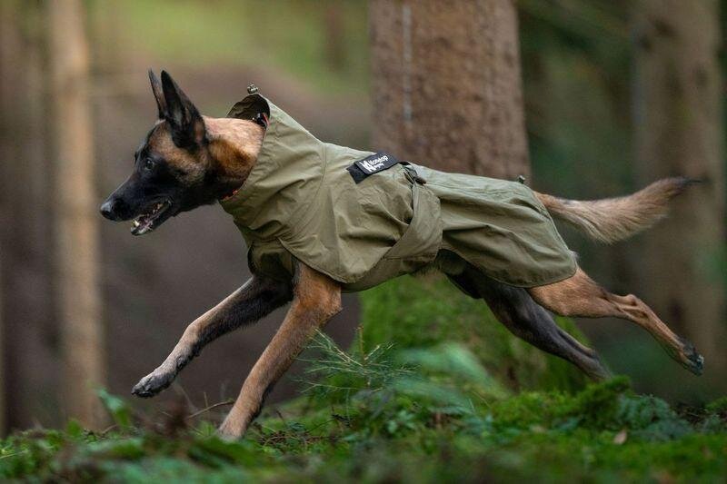 Der Regenmantel wurde für volle Bewegungsfreiheit entwickelt und verfügt über verstellbare Züge an Kopf, Hals und Rücken für eine perfekte Passform. Die Beingurte halten die Jacke auch bei starkem Wind sicher, und wenn er einmal eingestellt ist, bleibt er an Ort und Stelle, selbst wenn die Leinenöffnung in der Mitte des Rückens verwendet wird.Das verstellbare Bauchteil schützt Deinen Hund vor Schlamm und ist mit Drainagelöchern versehen, die verhindern, dass sich Wasser unter der Brust Deines Hundes sammelt, was Unbehagen und Kälte reduziert.Das geräuschlose Außenmaterial maximiert die Unauffälligkeit Deines Hundes bei Einsätzen. Klettverschluss-Systeme auf jeder Seite ermöglichen individuelle Patches zur Kennzeichnung oder Verbesserung der Sichtbarkeit.