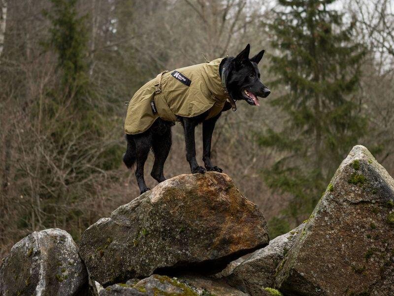 Ein robuster, wind- und wasserdichter Regenmantel für Hunde, die im Einsatz sind. Er hält strömendem Regen stand, bleibt auch bei starkem Wind an Ort und Stelle...