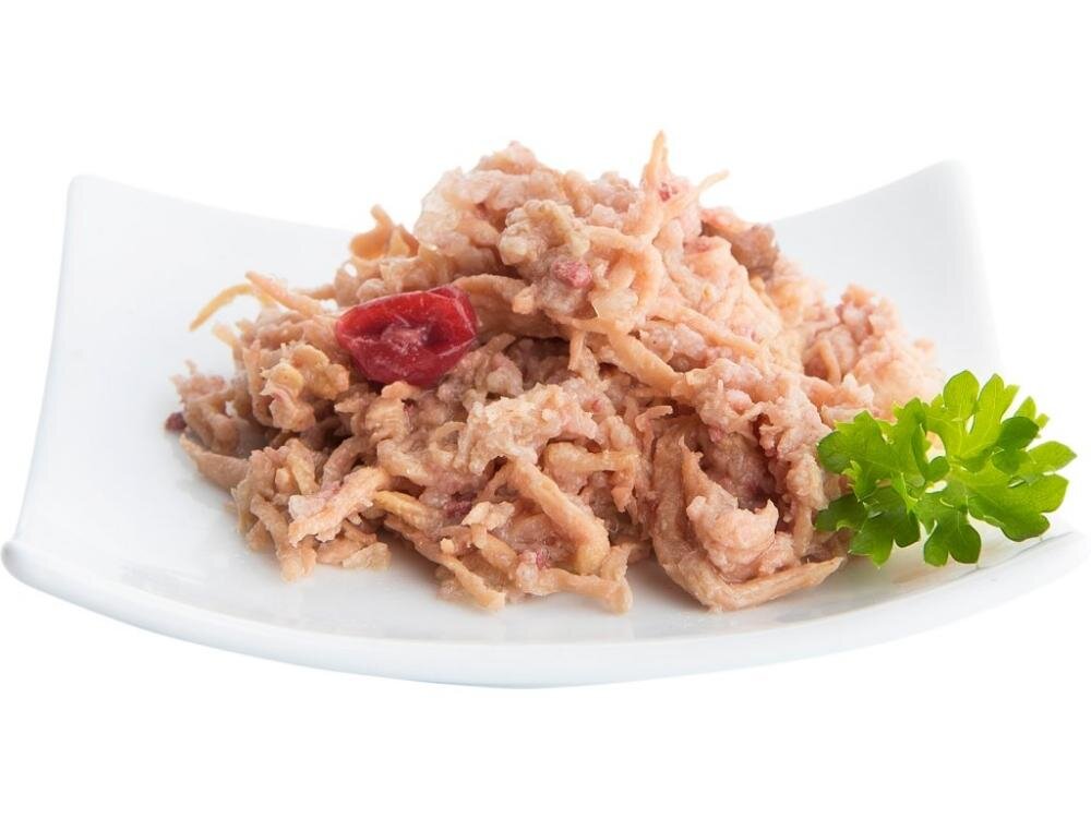 Zutaten: 60% Huhn, Hühnerleber, Hühnerfett, 36,8% Brühe, 2% Preiselbeeren, 1% Mineralien, 0,2% Leinöl = 100% Premiumzutaten. Analytische Bestandteile: Rohprotein 12%, Rohfett 5,5%, Rohasche 2,3%, Rohfaser 0,5%, Feuchtigkeit 76%.