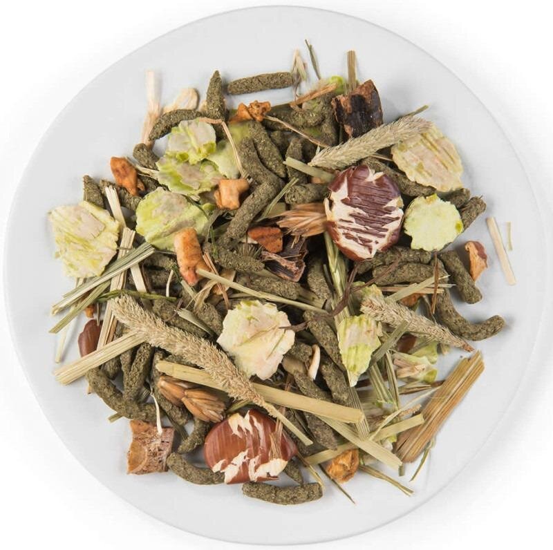 - Pflanzliche Nebenerzeugnisse (4% Timothy Heu), Gemüse (9% Erbsen, 5% Bohnen, 1,5% Petersilie), Getreide, Früchte (3% Apfel), Öle und Fette, Mineralien