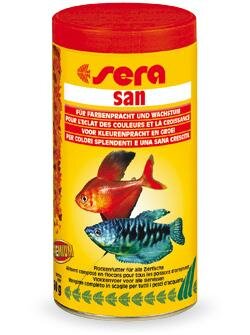 sera san® für Farbenpracht bei allen Zierfischen. Flockenfutter mit Fisch- und Getreidemehl sowie Seealgen und Spirulina. Die ausgewogene Zusammensetzung und der hohe Protein- sowie Vitamingehalt führen zu hervorragendem und gesundem Wachstum. sera san® verbessert die Zuchtergebnisse und wird auch von heiklen Fischen gerne angenommen.